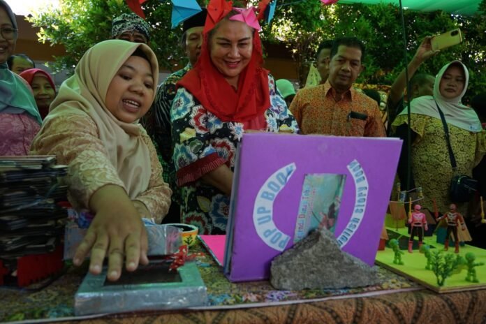 Pada kesempatan tersebut, Mbak Ita meninjau stan siswa dan sesekali bercengkrama dengan anak-anak untuk menanyakan terkait produk mereka yang berasal dari daur ulang sampah.