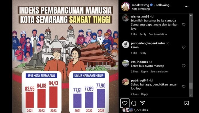 Beberapa hari lalu, Wali Kota Semarang, Hevearita Gunaryanti Rahayu mengunggah grafik indeks pembangunan manusia dan grafik umur harapan hidup di kotanya.