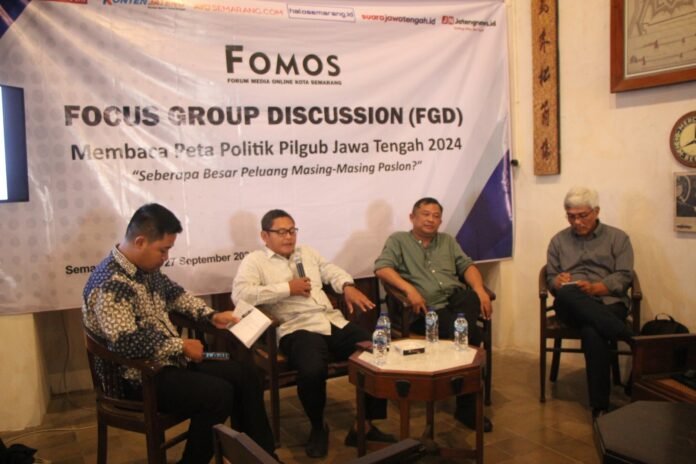 Hal itu terungkap pada Focus Group Discussion (FGD) yang digelar Forum Media Online Kota Semarang (FOMOS) dengan tema “Membaca Peta Politik Pilgub Jawa Tengah 2024; Seberapa Besar Peluang Masing-masing Paslon?” di Rumah Popo Kawasan Kota Lama Semarang, Jumat (27/9/2024).