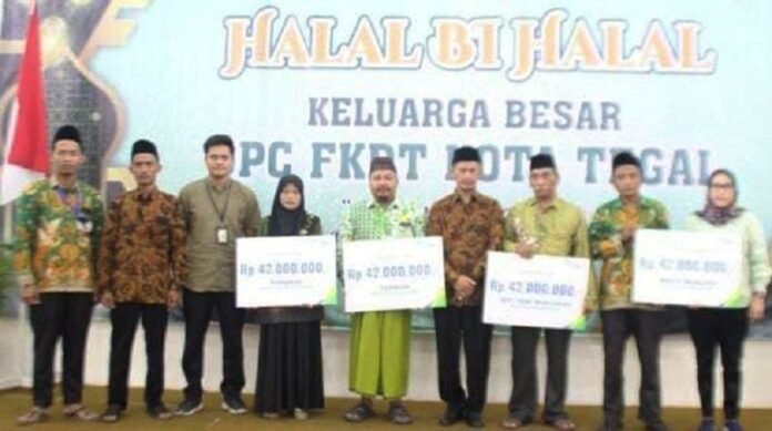 Pemberian santunan oleh BPJS Ketenagakerjaan Cabang Tegal disela-sela acara halal bihalal yang digelar Dewan Pimpinan Cabang (DPC) Forum Komunikasi Diniyah Takmiliyah (FKDT) Kota Tegal di gedung Arofah kompleks GOR Wisanggeni Kota Tegal pada Sabtu 12 April 2025.