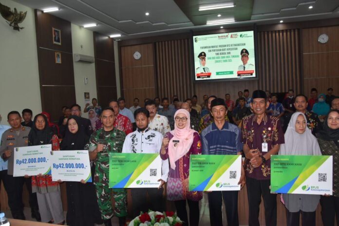 Bupati Eisti’anah dalam sambutannya menekankan pentingnya perlindungan sosial ketenagakerjaan bagi semua lapisan masyarakat.