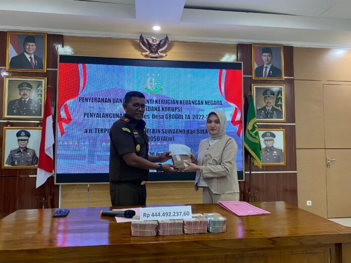 “Penyerahan uang pengganti kerugian keuangan negara dari rekening penitipan Kejaksaan Negeri Demak dalam perkara tindak pidana korupsi penyalahgunaan APBDes Desa Grogol Tahun Anggaran 2022–2023 sebesar Rp 444.492.237, telah dilaksanakan sesuai putusan pengadilan,” ujar Kajari.