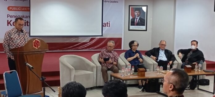 Kuliah umum turut menghadirkan narasumber lain, di antaranya Arief T. Surowidjojo, Dian Rosita, Ph.D., dan Dr. Aria Suyudi dari Sekolah Tinggi Ilmu Hukum Jentera, serta diikuti mahasiswa secara langsung dan melalui kanal YouTube Universitas Harkat Negeri.(02)