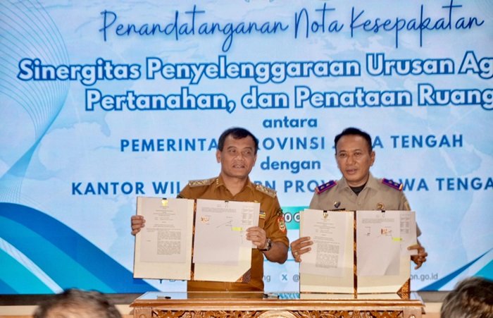SEMARANG, Jatengnews.id  – Pemerintah Provinsi Jawa Tengah bersama Kantor Wilayah Badan Pertanahan Nasional (BPN) Jateng menandatangani nota kesepakatan tentang sinergi urusan pertanahan, agraria, dan penataan ruang, Senin (20/10/2025).