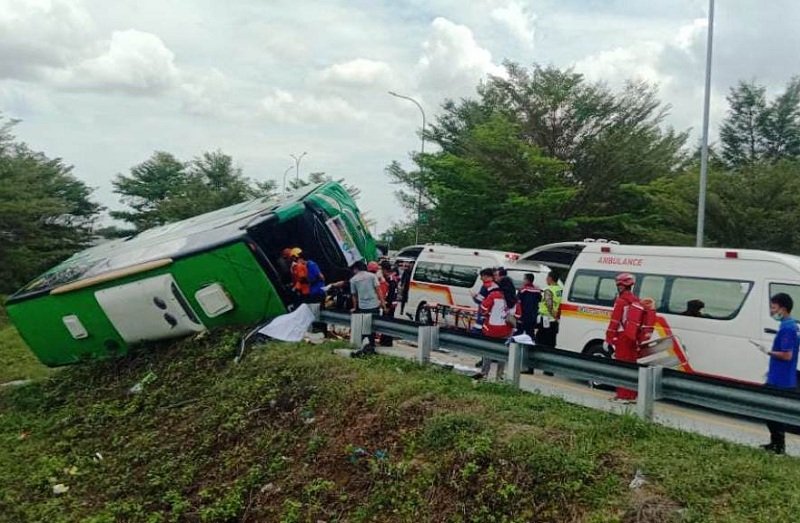 Sebuah bus pariwisata yang membawa rombongan tersebut terguling di Exit Tol 312B hingga nyaris keluar jalur.
