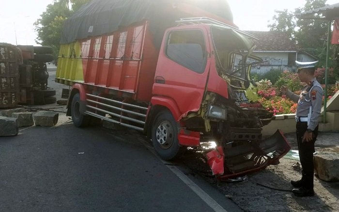 Kecelakaan terjadi saat truk canter P-8012-UK yang dikemudikan Akbar Maulana (21) menabrak bagian belakang truk dump R-1963-CW yang dikemudikan Rois Alva Izi (22) hingga terguling.