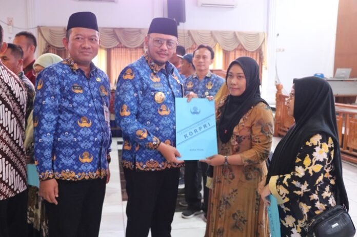 Wali Kota Tegal, Dedy Yon Supriyono, menyerahkan santunan kepada 18 ahli waris anggota Korpri yang meninggal saat masih aktif berdinas, serta tali asih kepada petugas pembersih sungai dari Tim Banjir Kanal DPUPR.