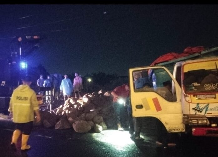 “Kendaraan kemudian oleng hingga terguling, menyebabkan muatan batu tumpah dan menutup akses jalan dari arah timur,” jelasnya.