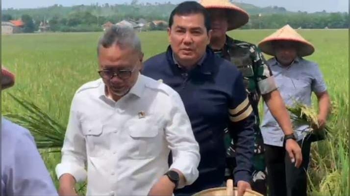 Tiba dengan helikopter, Zulkifli meninjau hamparan sawah dan ikut melakukan panen simbolis bersama para petani. Ia menegaskan pentingnya sektor pertanian sebagai penopang ketahanan pangan nasional.