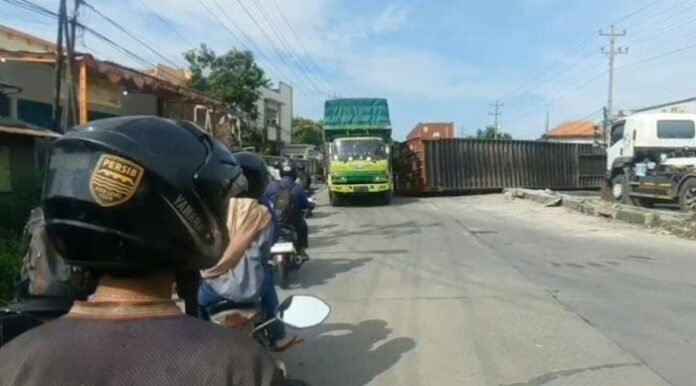 Truk kontainer bernomor polisi H 8697 RO yang melaju dari arah Semarang menuju Jakarta dengan muatan logam besi terguling hingga peti kemas terlepas dan melintang menutup hampir seluruh badan Jalan Pantura Brebes.