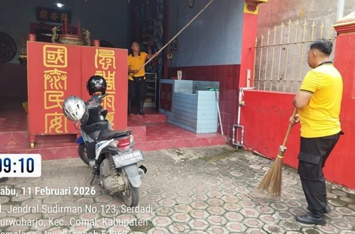 PEMALANG, Jatengnews.id – Menjelang perayaan Imlek 2026 pada 17 Februari, anggota Polsek Comal Polres Pemalang ikut membersihkan Klenteng Tin An Bio di Kelurahan Purwoharjo, Rabu (11/2/2026).