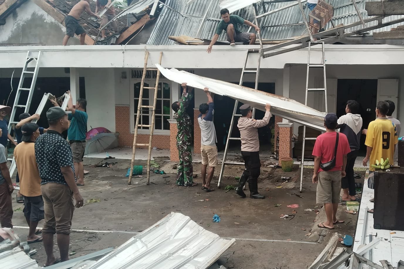 Sementara itu, Babinsa Koramil 12/Mranggen, Serma Indro Lestari, bersama warga melakukan gotong royong membersihkan puing-puing rumah yang rusak. Ia menjelaskan, kerusakan pada bagian atap rumah seperti kanopi, genteng, asbes, dan galvalum disebabkan oleh kuatnya terjangan angin.